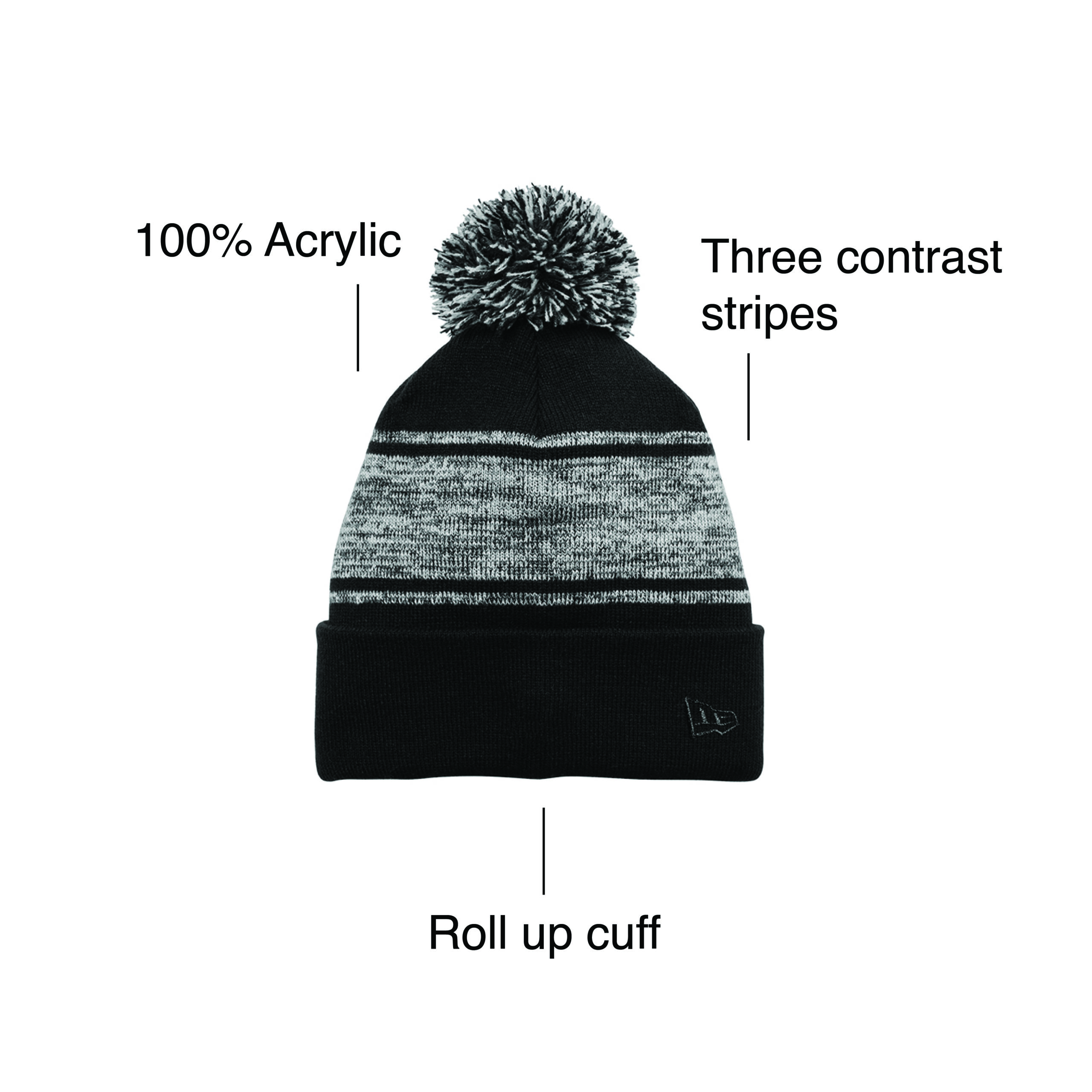 The New Era Knit Chilled Pom Beanie features three contrast stripes for a retro vibe and is made from 100% acrylic. It also has marled yarns for a trendy look and includes a tonal embroidered New Era flag. This beanie is perfect for businesses looking to make a bold statement at events or through giveaways. With options to personalize every aspect, from color to logo placement, you’ll stand out with ease.